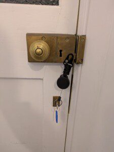 There are three accessible exits during your stay. Each has a key easily accessible near the lock attached to a mechanism. Please do not take the keys or remove them as they are provided for fire safety purposes only. ( See images above for your reference)