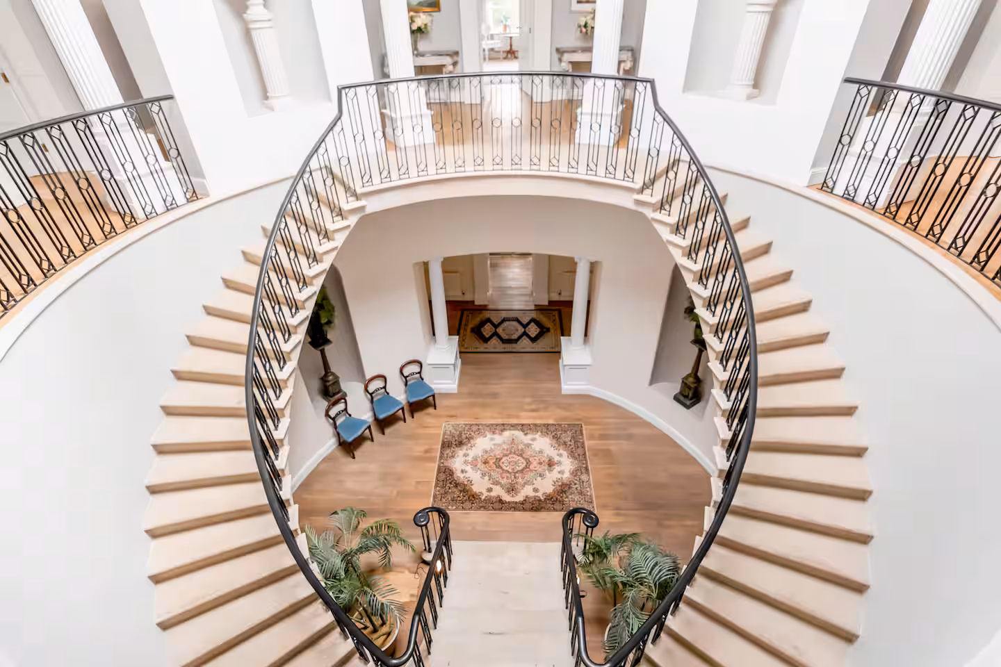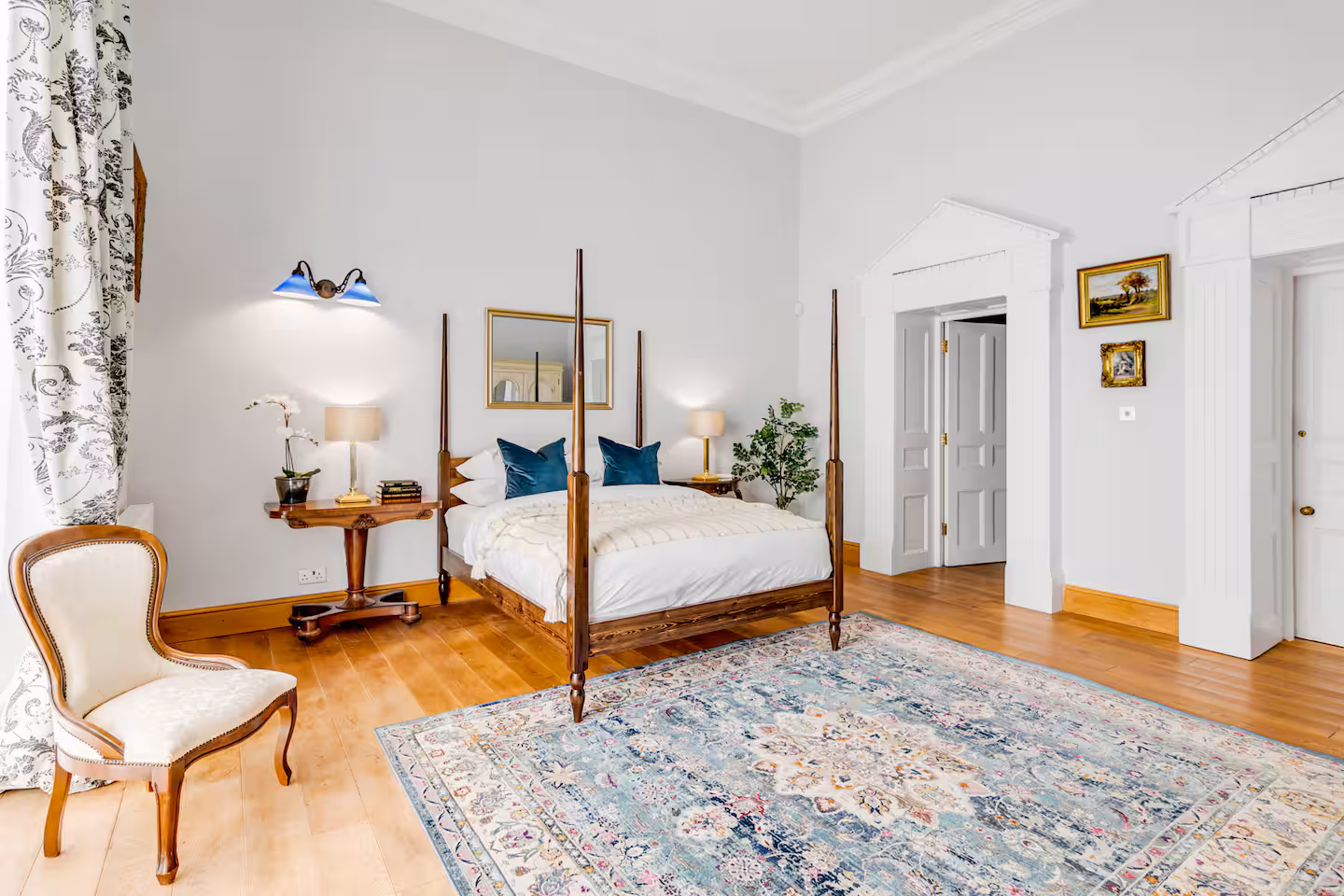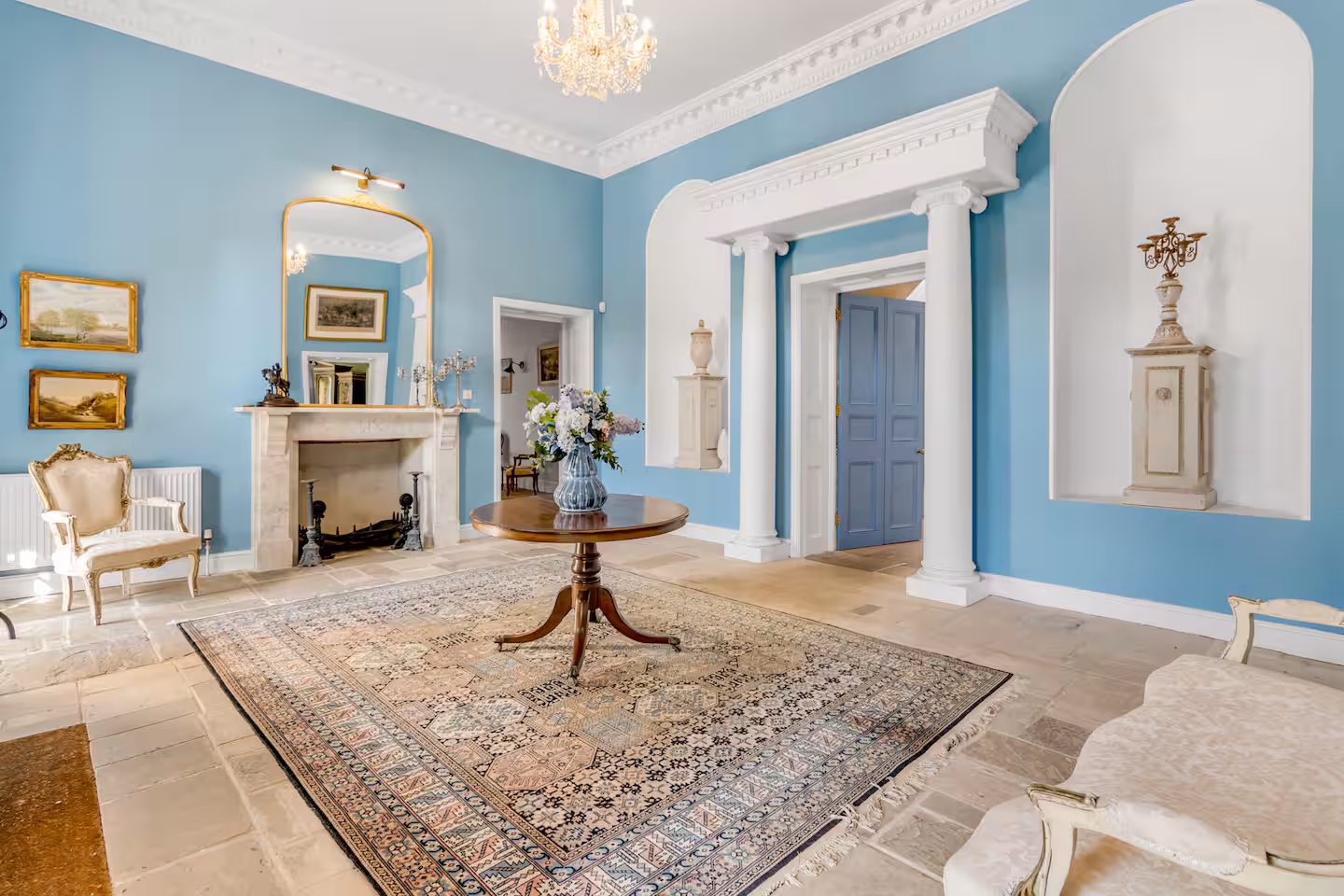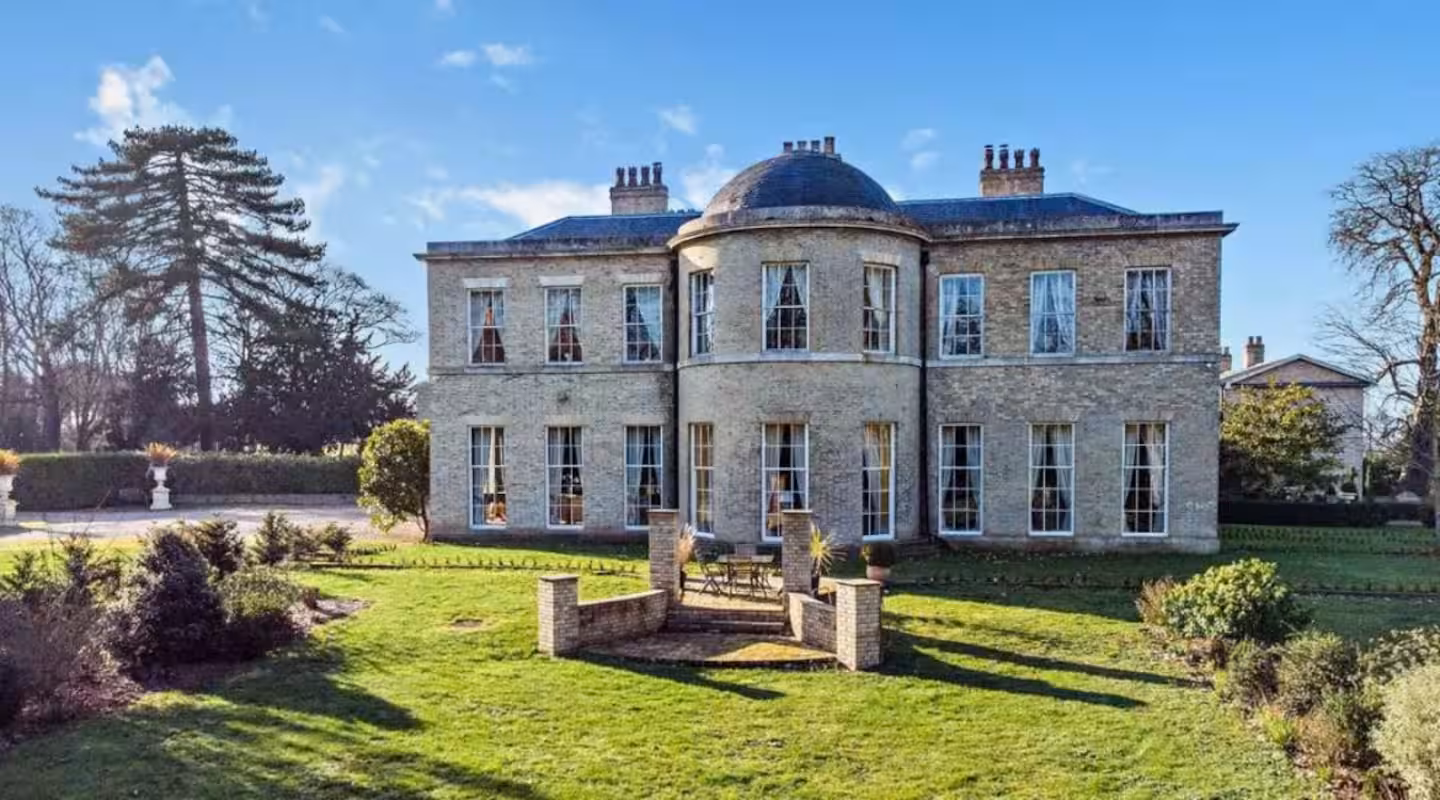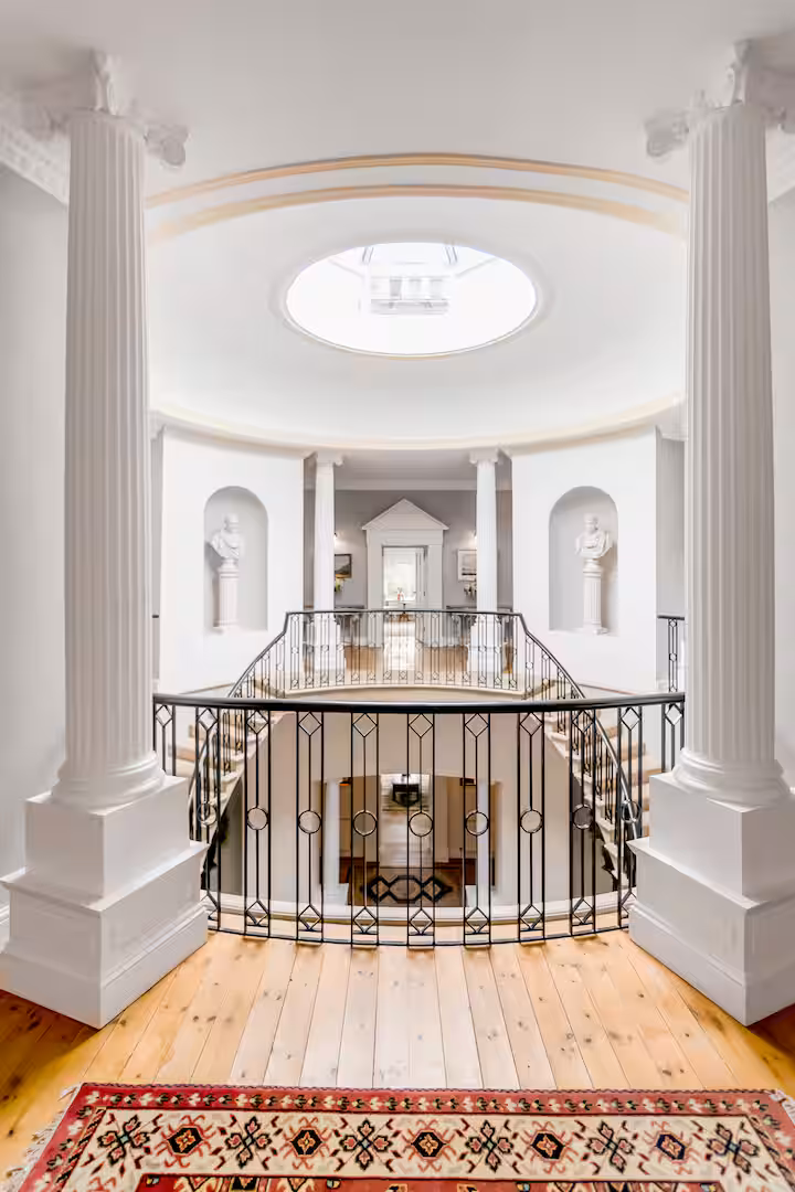 This exceptional Georgian manor showcases elegant proportions, soaring ceilings, and striking architectural detail throughout. Highlights include the impressive entrance hall with its domed ceiling and sweeping imperial staircase.