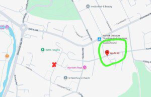 Set your sat nav to Wolfe Road, NR1 4HT for parking, then walk back to the house at Gas Hill (marked with the red X).